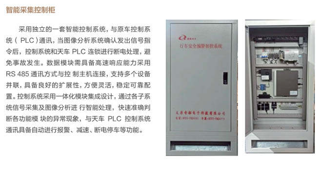 6、行車智控系統(tǒng):控制系統(tǒng)采用一體化模塊集成設(shè)計, 通過各子系統(tǒng)信號采集及圖像分析進(jìn) 行智能處理,快速準(zhǔn)確判斷各功能模 塊的異,F(xiàn)象,與主機PLC控制系統(tǒng) 通訊連接具備自動進(jìn)行報警、減速、斷電停車等功能,當(dāng)系統(tǒng)確認(rèn)發(fā)出信號指令后,控制系統(tǒng)和行車PLC連鎖進(jìn)行斷電處理,避免事故發(fā)生。